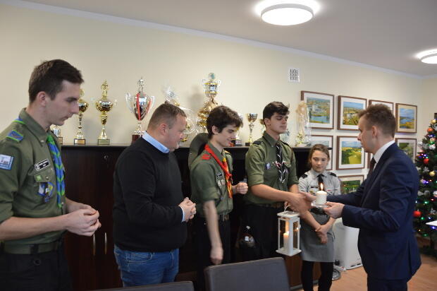Starosta Piotr Kołodziejczyk podkreślił wagę pracy harcerzy w kształtowaniu obywatelskich postaw młodych osób i podziękował za gotowość do wspólnych działań. Światełko Betlejemskie, które przynieśli myszkowscy harcerze z zastępcą Komendanta Hufca Tomaszem Szlenkiem na czele zapłonęło w gabinecie Starosty.