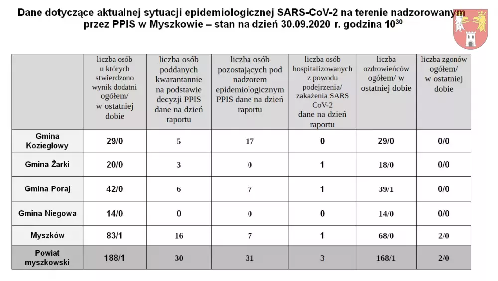 Przedstawiamy aktualną sytuację epidemiologiczną na terenie Powiatu Myszkowskiego na dzień. 30.09.2020, godz. 10.30. Dane udostępnia Powiatowa Stacja Sanitarno-Epidemiologiczna w Myszkowie.