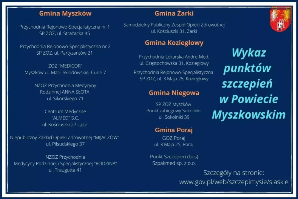 Wykaz punktów szczepień dla Powiatu Myszkowskiego znajdą Państwo na stronie:https://www.gov.pl/web/szczepimysie/slaskie (należy rozwinąć zakładkę „filtry” i wpisać nazwę powiatu), jak również w dalszej części niniejszego artykułu.