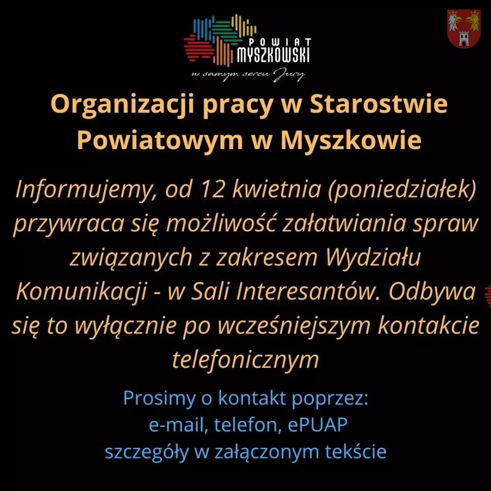 Informujemy, że od 12 kwietnia (poniedziałek) w Starostwie Powiatowym w Myszkowie przywraca się możliwość załatwiania spraw z zakresu Wydziału Komunikacji i Transportu w Sali Interesantów. Odbywa się to po wcześniejszym telefonicznym ustaleniu terminu wizyty. Od 12 kwietnia będzie też czynna kasa w Sali Obsługi.