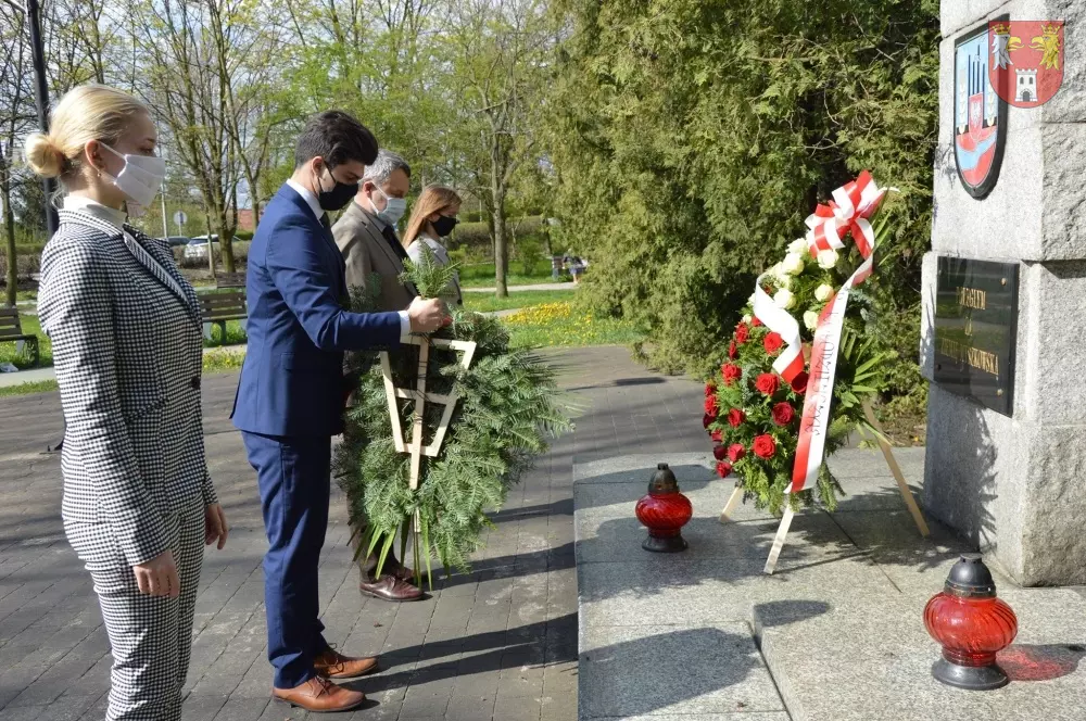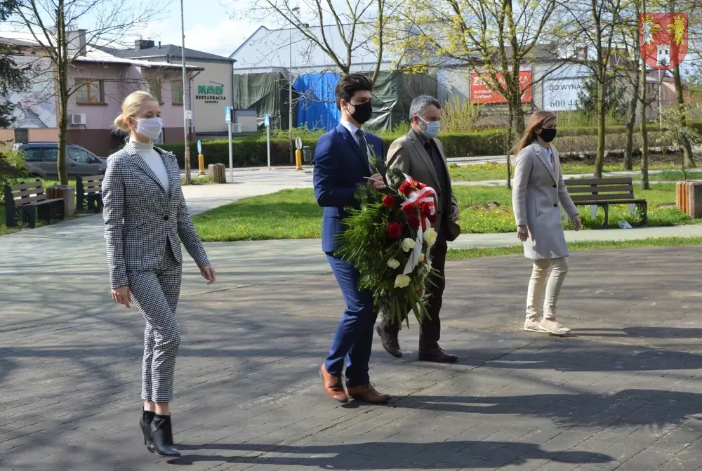 Okolicznościowe kwiaty złożyła również delegacja Forum Młodzieży Powiatu Myszkowskiego z opiekunem, którym jest Wiceprzewodniczący Rady Powiatu Janusz Romaniuk. Wiązankę składali Jakub Wójcik, Milena Morawiec, Nikola Pęczek.