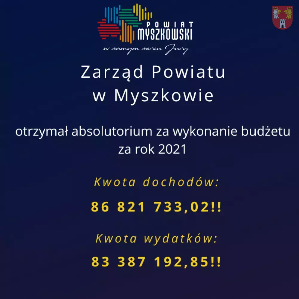 Rada Powiatu w Myszkowie udzieliła absolutorium Zarządowi Powiatu w Myszkowie. Należy podkreślić, że Powiatu Myszkowski osiągnął znakomite wyniki i – pomimo trudności związanych z pandemią – stabilność finansowa utrzymywała się na stałym, wysokim poziomie. Na uwagę zasługuje fakt, że Zarząd wykorzystywał pozyskane zewnętrzne środki finansowe, a także intensywnie współpracował z gminami oraz ościennymi powiatami.