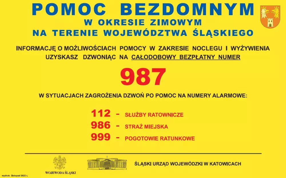 Wzorem lat ubiegłych Śląski Urząd Wojewódzki w Katowicach wydał plakat informujący o bezpłatnym trzycyfrowym numerze telefonu 987 pod którym można uzyskać informację o możliwości pomocy w zakresie noclegu i wyżywienia dla osób bezdomnych na terenie województwa śląskiego oraz informujący o numerach telefonów alarmowych.