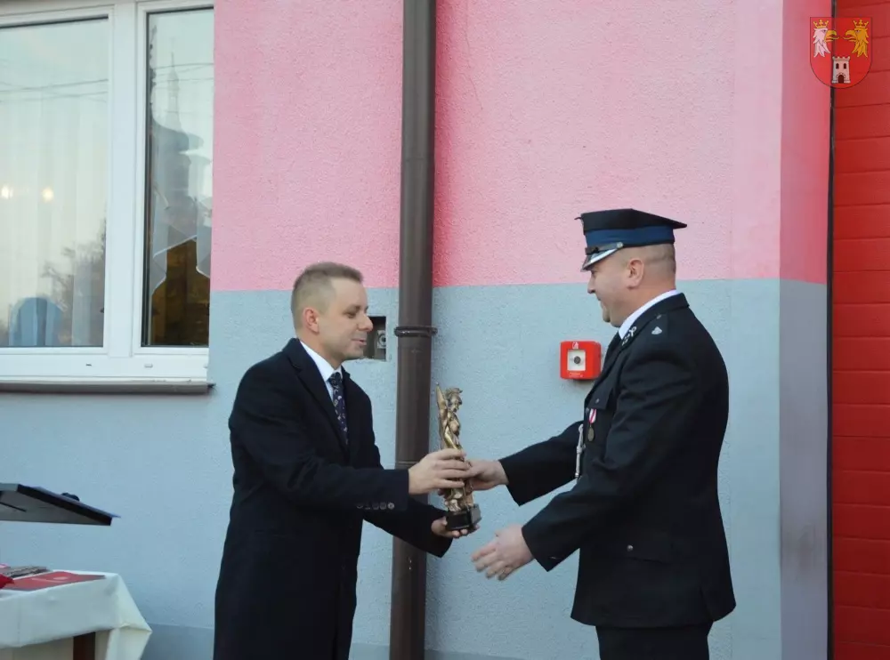 Starosta Piotr Kołodziejczyk przekazał na ręce Prezesa OSP Przybynów okolicznościowy upominek oraz pogratulował wieloletniej służby na rzecz mieszkańców gminy i całego Powiatu Myszkowskiego.