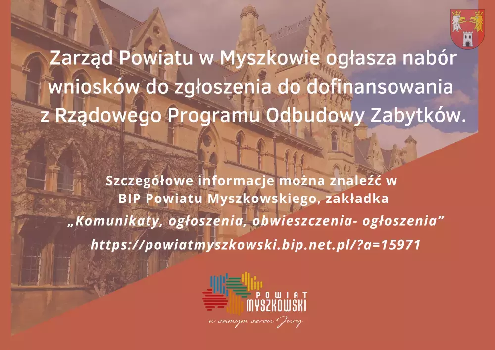 Zarząd Powiatu w Myszkowie ogłasza nabór wniosków do zgłoszenia do dofinansowania z Rządowego Programu Odbudowy Zabytków.