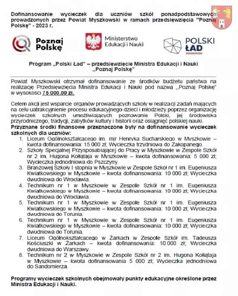 Dofinansowanie wycieczek dla uczniów szkół ponadpodstawowych prowadzonych przez Powiat Myszkowski w ramach przedsięwzięcia "Poznaj Polskę" - 2023 r.