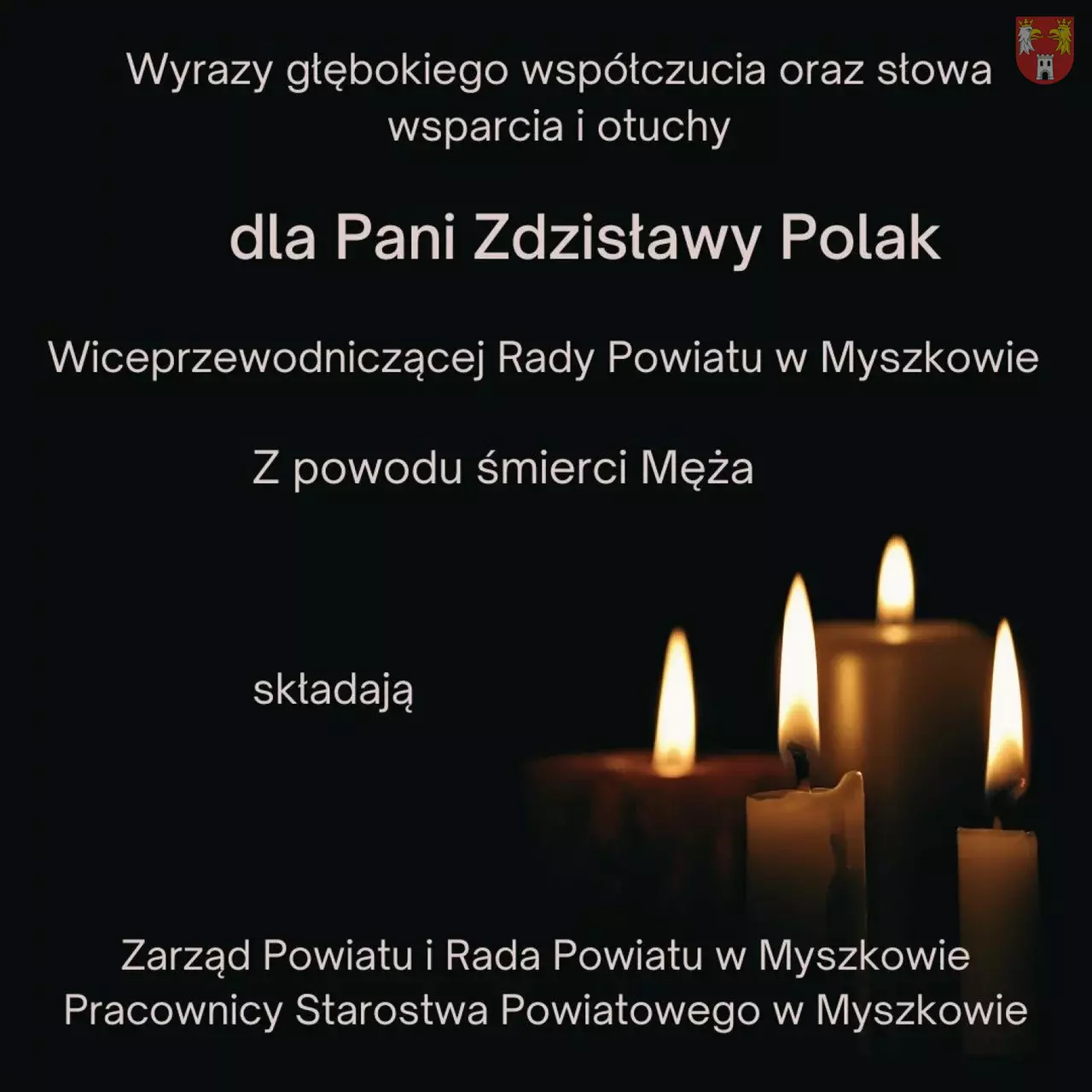 Wyrazy głębokiego współczucia oraz słowa wsparcia i otuchy dla Pani Zdzisławy Polak, Wiceprzewodniczącej Rady Powiatu w Myszkowie, z powodu śmierci Męża - składają Zarząd Powiatu i Rada Powiatu w Myszkowie, Pracownicy Starostwa Powiatowego w Myszkowie