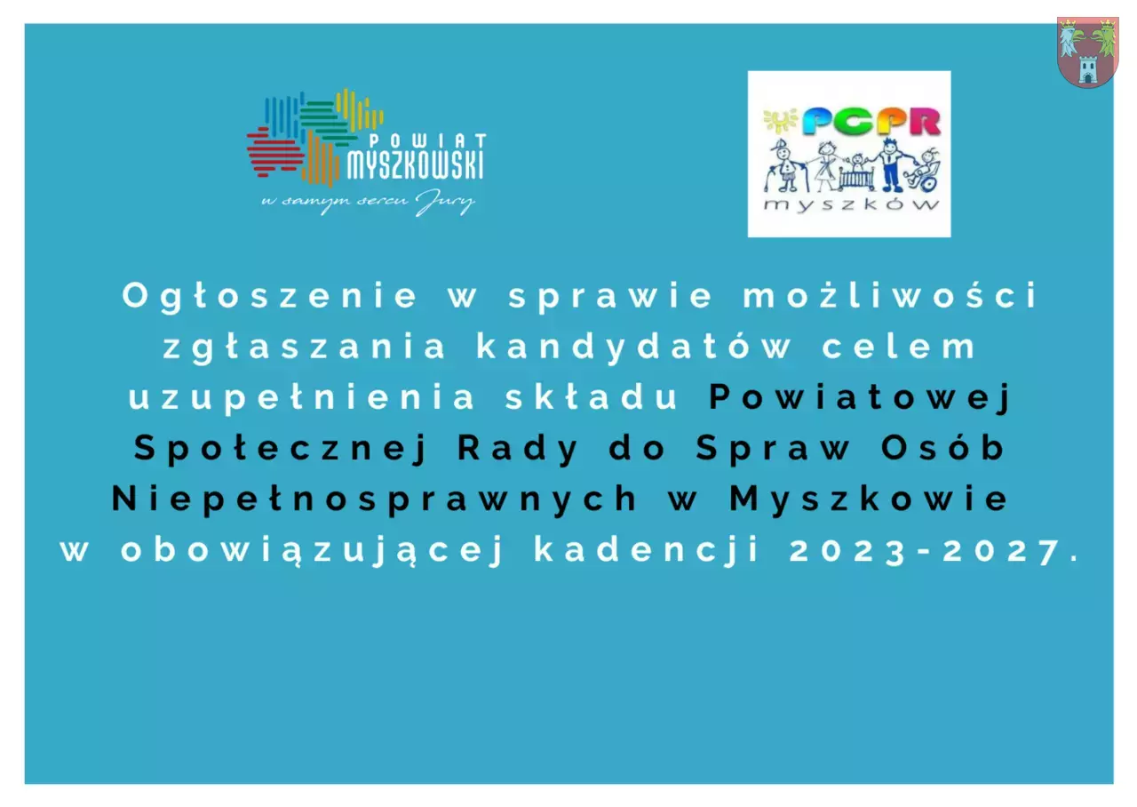 Powiatowe Centrum Pomocy Rodzinie w Myszkowie informuje, iż w dniu 25 września 2024 roku Starosta Myszkowski wydał ogłoszenie w sprawie możliwości zgłaszania kandydatów celem uzupełnienia składu Powiatowej Społecznej Rady do Spraw Osób Niepełnosprawnych w Myszkowie w obowiązującej kadencji 2023-2027.