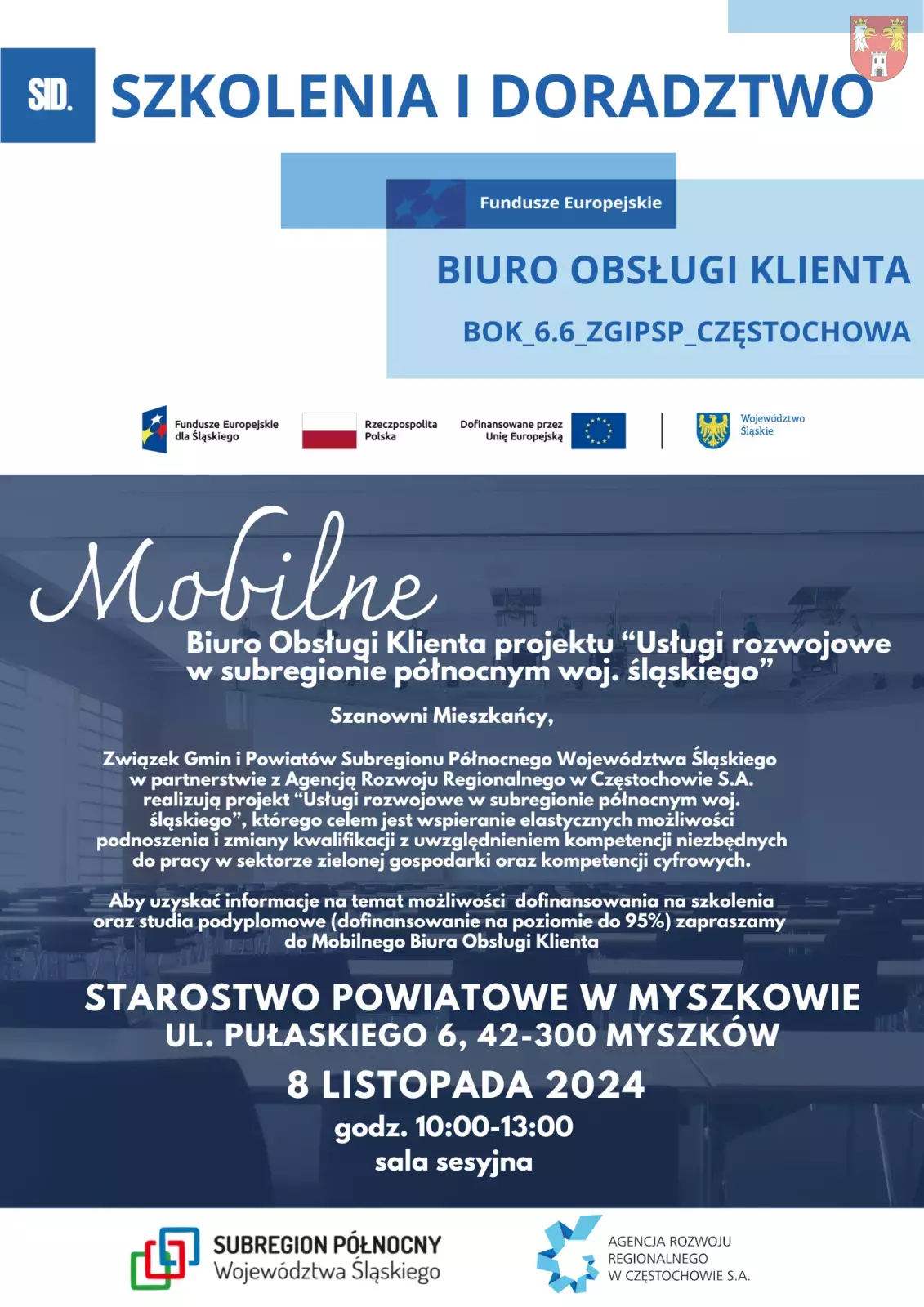 Związek Gmin i Powiatów Subregionu Północnego Województwa Śląskiego zaprasza mieszkańców Subregionu Północnego do zapoznania się z warunkami pozyskania dofinansowania na szkolenia i studia podyplomowe w ramach projektu „Usługi rozwojowe w subregionie północnym województwa śląskiego”